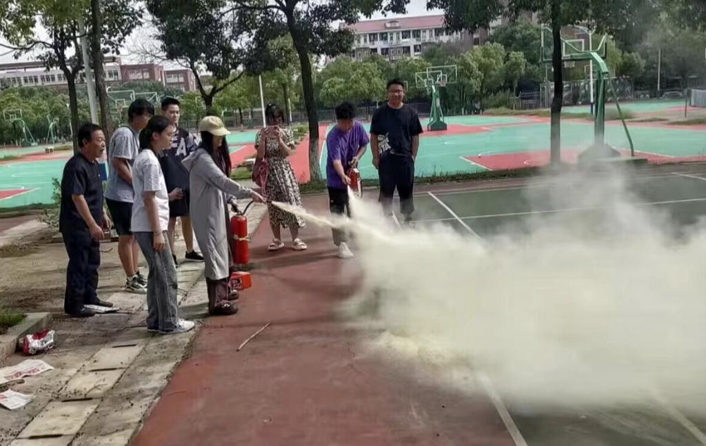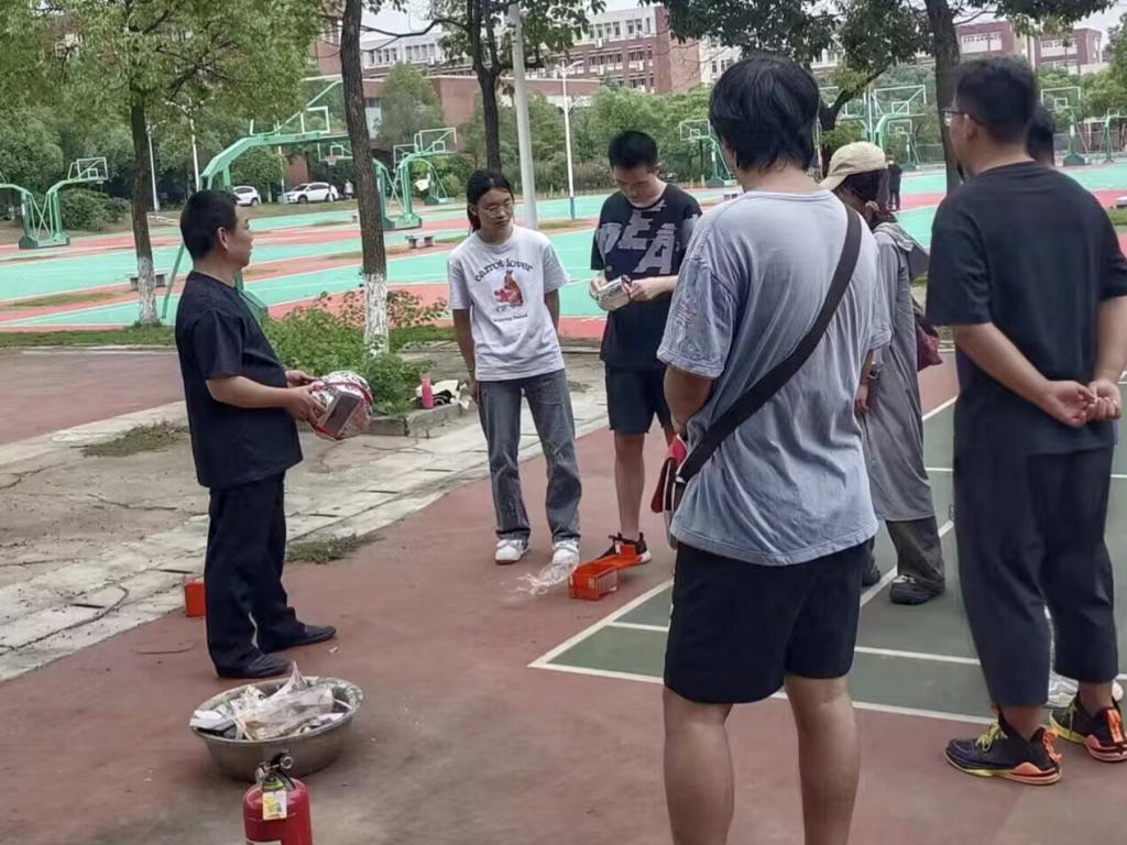消防专干易国安给同学们详细讲解了消防防毒面具的使用方法和灭火器“摇、拉、握、压”的使用步骤,并逐一指导同学们完成了防毒面具的佩戴和灭火实操演练。