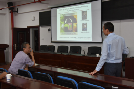演讲会结束以后,欧阳润海对老师、学生的问题进一步讲解,并且对SISSO方法进行了一个更浅显的阐述,晁自胜院长也就数据驱动材料与高端催化新材料交叉的可行性与欧阳润海进行了深入交流。