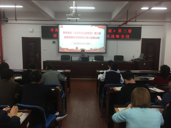 9月29日下午,材料学院举行了《习近平谈治国理政》第三卷专题学习会,全院教职工参加了学习,院党总支书记张国强主持学习会并作了题为“学深悟透《习近平谈治国理政》第三卷,深刻把握中华民族伟大复兴战略全局”的专题领学。