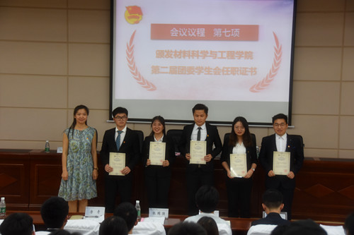 伴随着嘹亮而庄严的国歌声,正式会议拉开了帷幕。张国强对本次会议的顺利召开表示了祝贺,他代表学院党总支对学生干部们的辛勤付出表达了感谢,并希望大家努力提升自我,传承材料学院天道酬勤、自强不息的精神,努力拼搏奋勇向前。会议表决通过了《团委学生会工作报告》和《代表提案工作报告》。最后,唐青、陈鑫林为学生干部们颁发了任职证书,并公布了得票结果。至此,大会圆满结束。