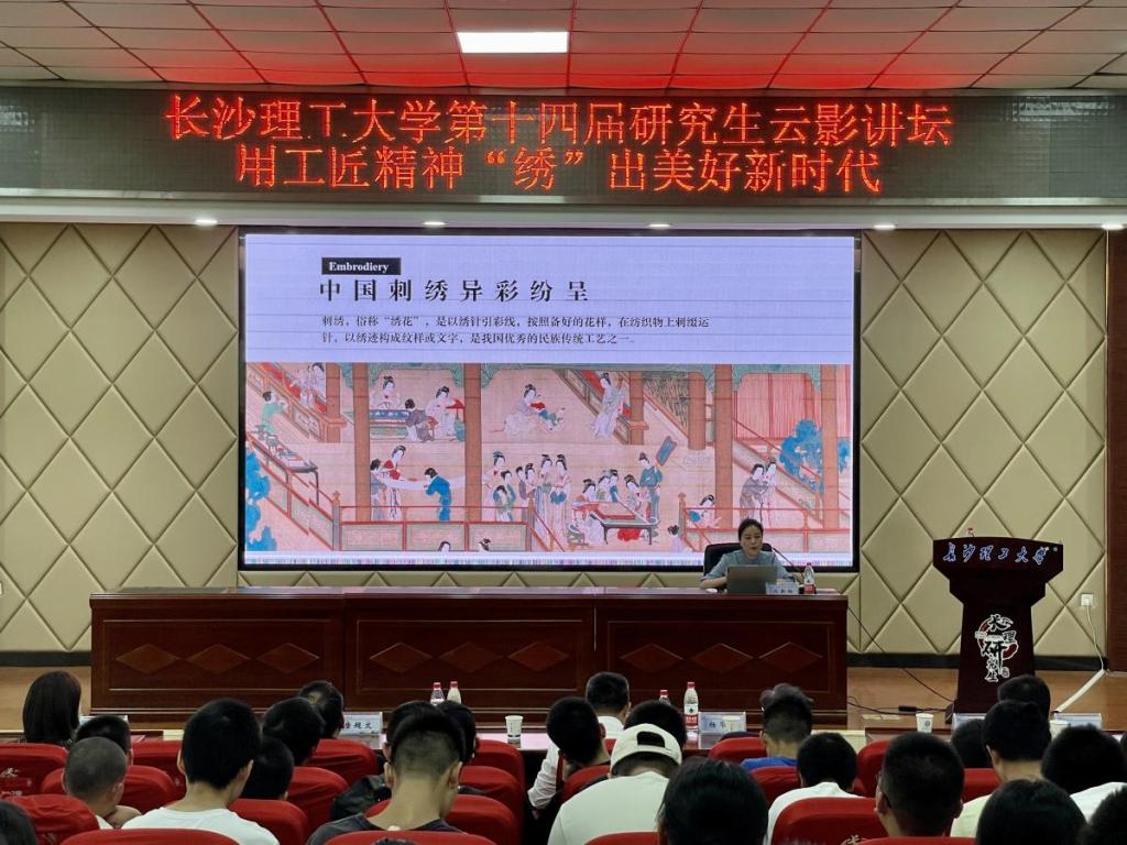 10月25日下午,由永利集团88304官网研究生院主办、材料科学与工程学院承办的第十四届研究生云影讲坛在云塘校区文科楼A200举行,本次讲座邀请到湖南省湘绣研究所湘绣生产部主任成新湘女士担任主讲嘉宾。讲座由材料学院党总支副书记陈华主持,永利集团88304官网党委委员、副校长胡永乐、研究生院院长杨华锋、研究生院副院长兼研工部部长田上、材料学院党总支书记唐超文、副院长杨现锋出席,各学院研究生代表聆听了讲座。