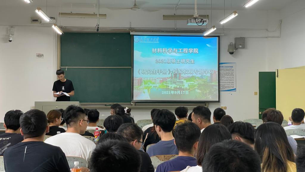9月17日下午,材料学院于金盆岭校区6号教学楼106举办校纪校规专题学习讲座暨2021级《研究生手册》考试,校纪校规专题学习讲座由院研会主席刘月明主讲,研究生手册考试由院研会主席团及各部部长监考,2021级全体研究生参加。