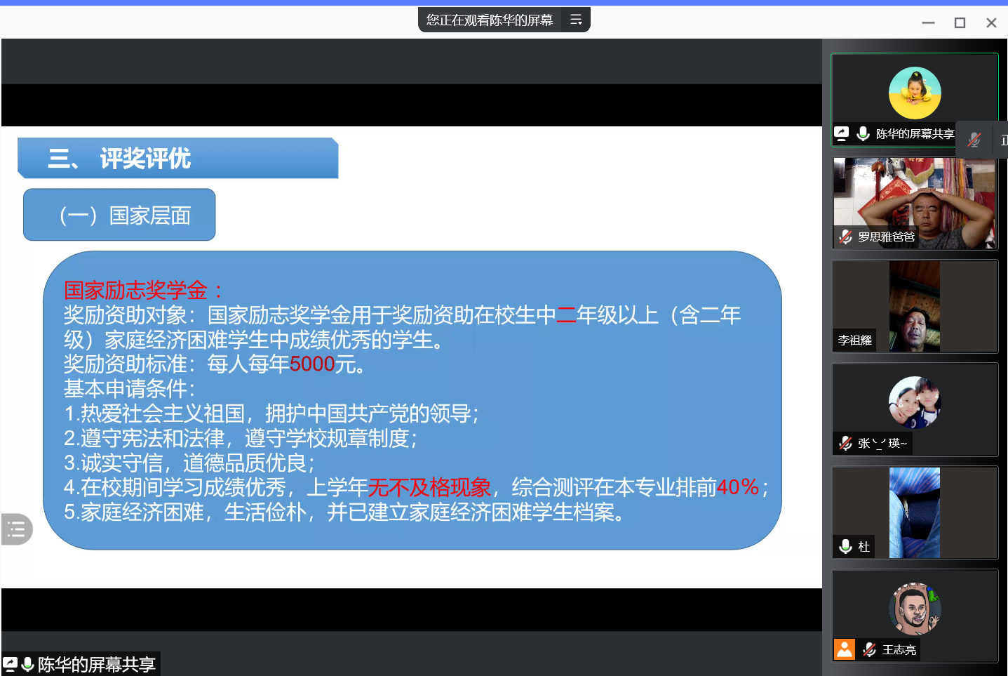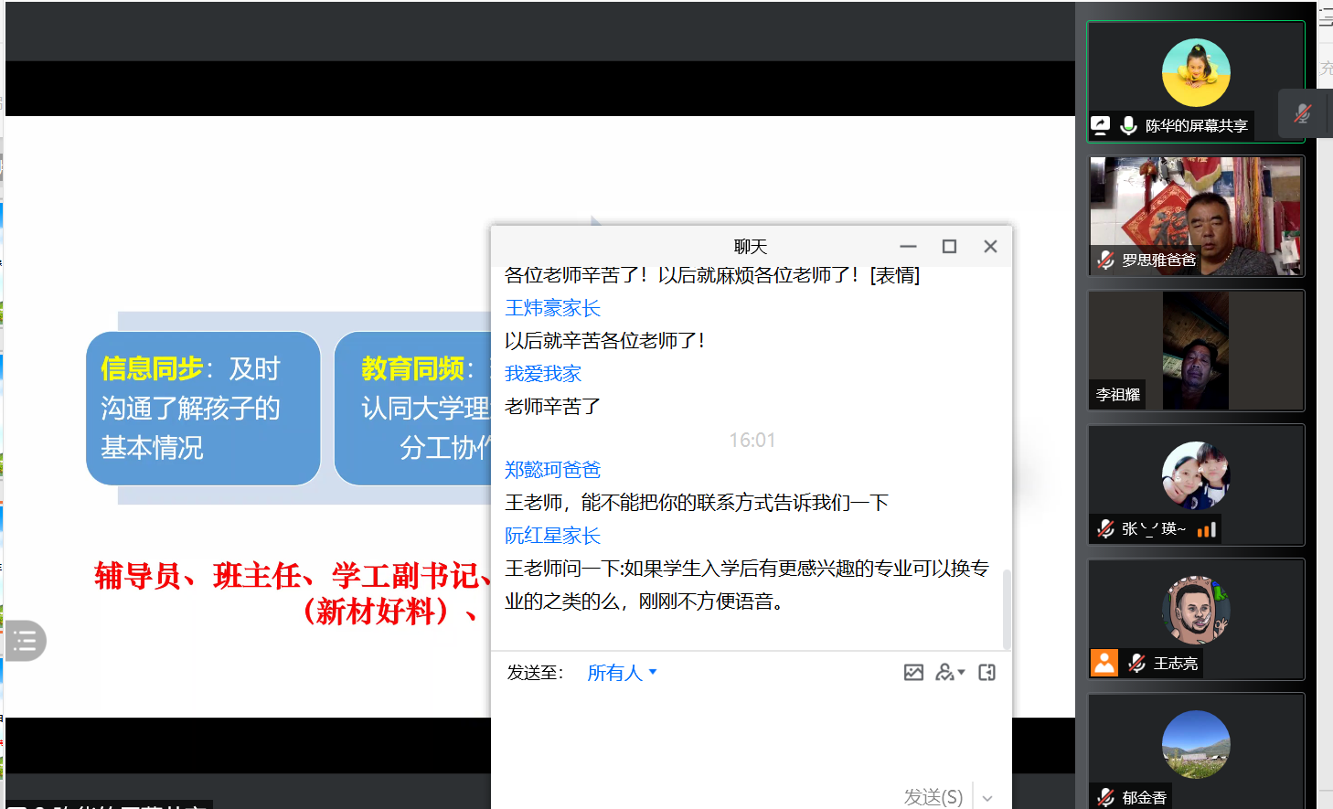 陈华以“深化‘家校联动’,打造教育合力”为主题,从校院简介、培养特色及成效、日常教育三方面向家长进行介绍,通过有效的信息沟通,整合学院与家庭教育的力量,促进学生“德智体美劳”全面发展。陈华对家长们存在的疑惑在线上进行了耐心的解答,引导家长们鼓励和相信学生个人。家长们纷纷表示了对工作的强烈支持,做好家校联动,共同努力将学生培养成有益于国家和社会的优秀人才。