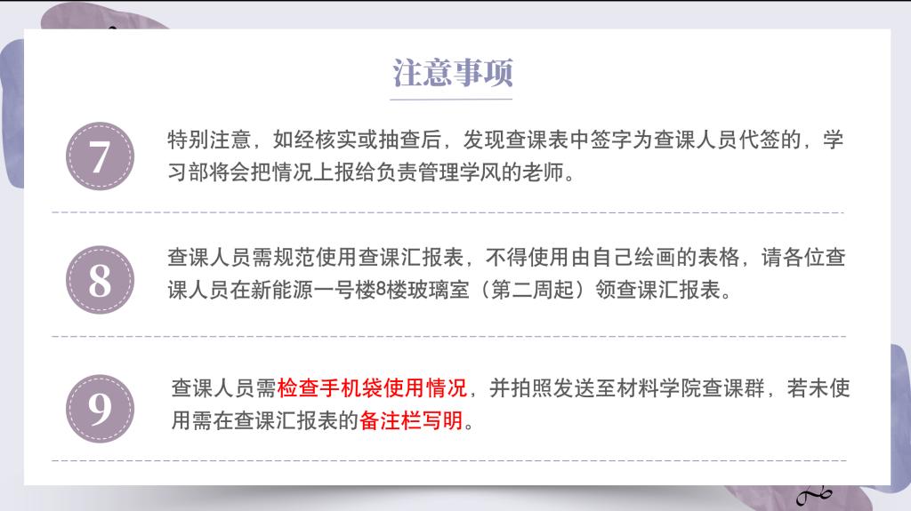 首先,杨静怡介绍了材料学院查课的目的。接着,她详细说明了查课流程和相关注意事项。随后,她重点讲解了各位查课人员需要谨记的查课注意事项。紧接着针对上述的阐述存有疑问的查课人员连麦,开展提问环节,主持人杨静怡为其详细解答。最后,王志亮老师总结发言,再次强调了查课制度的重要性,同时表达了对新任查课人员的期望与要求。