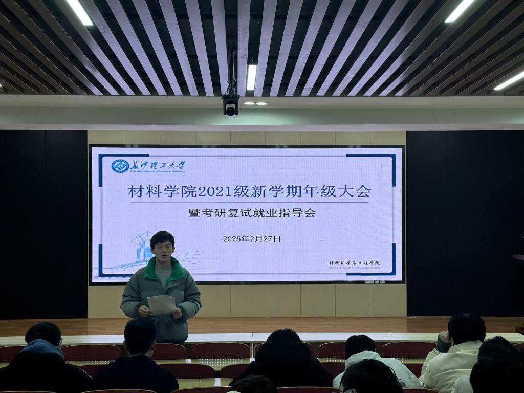 2月27日晚,材料科学与工程学院2021级本科生年级大会在云塘校区工科三号楼A201报告厅举行。学院党委副书记邵巧艳、就业辅导员谢易真、年级辅导员王志亮出席会议,全体2021级本科生参会。本次大会以"规划学业发展,导航职业未来"为主题,通过学情分析、考研指导、就业规划等专题内容,为同学们提供全方位的学业发展指导。