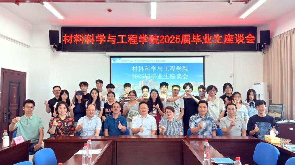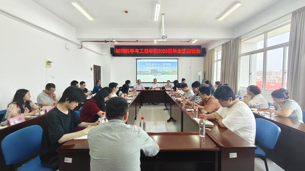 6月6日下午,材料学院于新能源大楼1栋908召开2025届毕业生座谈会,学院院长毛卫国、党委书记郑延恒、副院长谢炜、副院长李灵均、特邀党建组织员刘兴旺、无机系专任教师王杰、新能源系专任教师秦伟、实验中心主任贺浩出席会议,会议由党委副书记邵巧艳主持,王金哲等20余位毕业生代表参加。