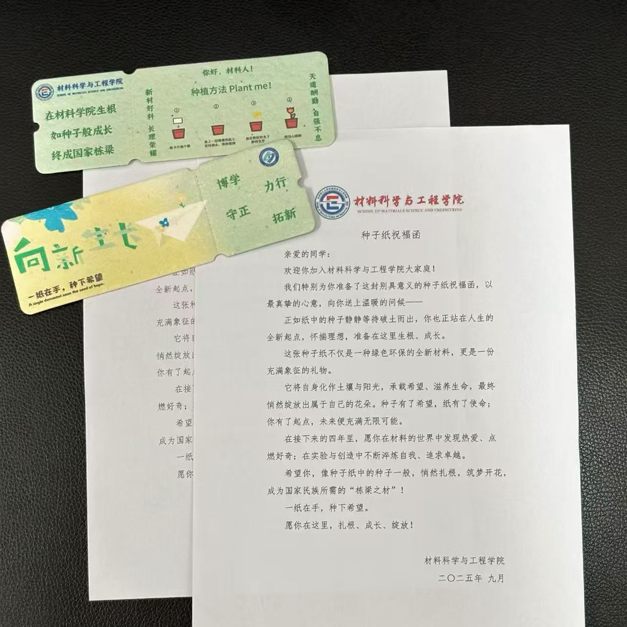据悉,2025级辅导员杨宁为每位新生准备了种子纸和祝福函,旨在鼓励新生在大学期间扎实学习、积极成长。期盼每一位学生都能如破土而出的种子一般,向下扎根,汲取营养,筑梦开花,成为国家民族所需的“栋梁之才”!