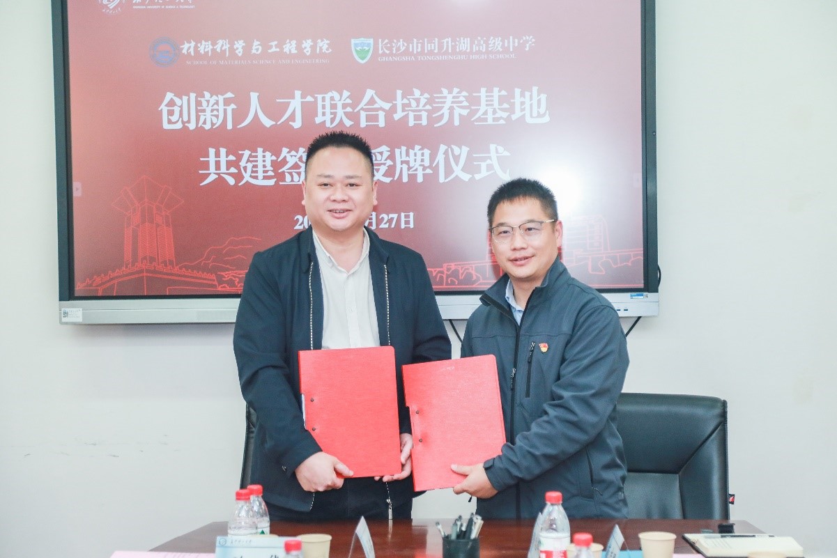 随后,毛卫国、向赞勋代表双方签署“创新人才联合培养基地”共建协议。毛卫国代表永利集团88304官网材料科学与工程学院向长沙市同升湖高级中学授牌。双方就加强人才培养输送、深化重点学科教学合作、合力共建创新实践平台等方面进行了深入交流,进一步达成了合作共识。