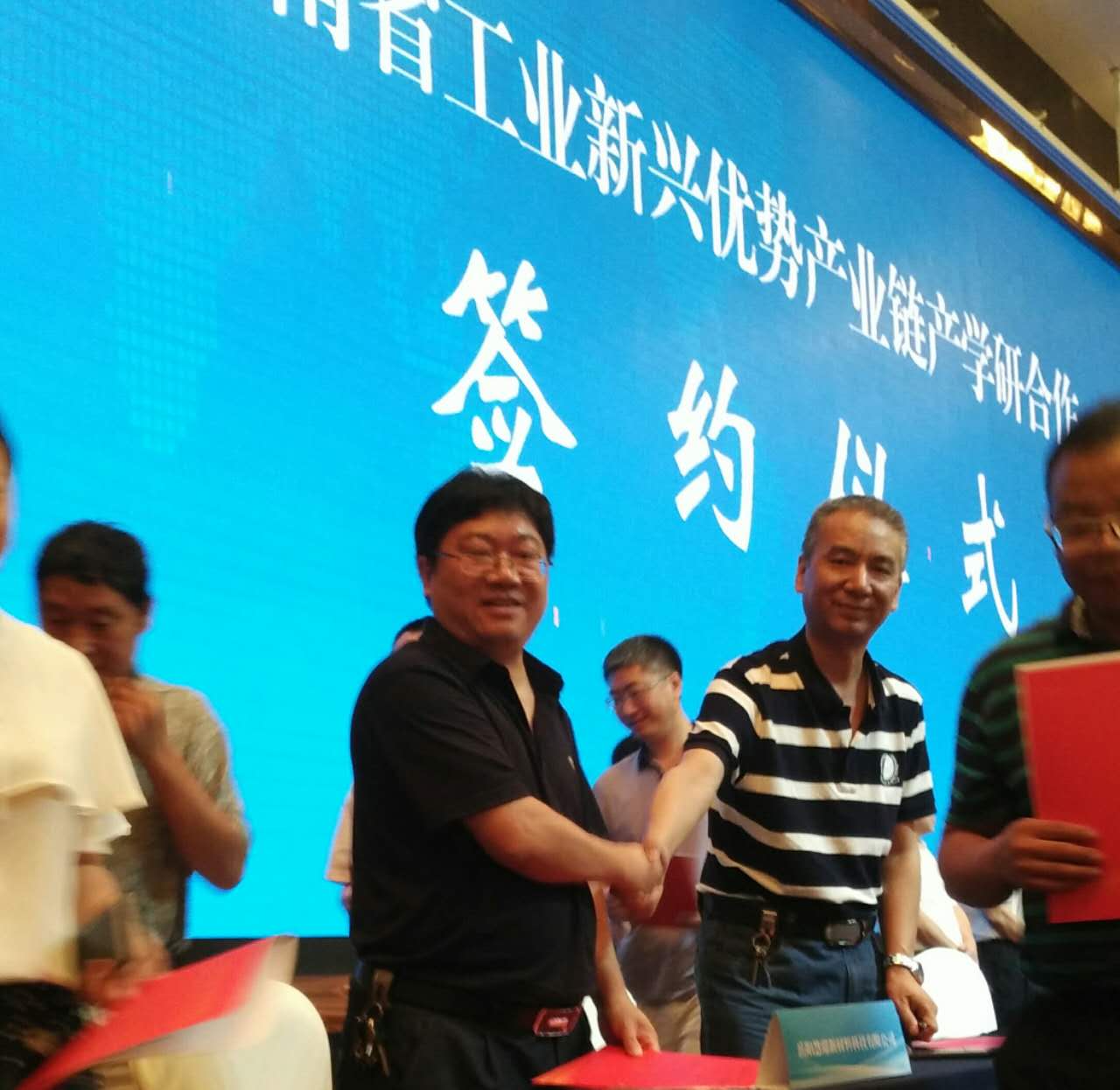 7月14日上午,湖南省经信委召开了2017年湖南省工业新兴优势产业链产学研合作对接会,永利集团88304官网材料学院院长晁自胜教授和岳阳县慧璟新材料科技有限公司总经理邹凌峰在会上签约,双方将携手合作,开发“纳米级ZSM-5分子筛”和“MTO催化剂”等材料。岳阳慧璟新材料科技有限公司是一家高新技术企业和新材料企业,主要研发、生产、经营Y型分子筛、ZSM-5系列分子筛、拟薄水铝石(干胶粉)等产品。该公司与我院晁自胜教授课题组有深厚的产学研合作基础。