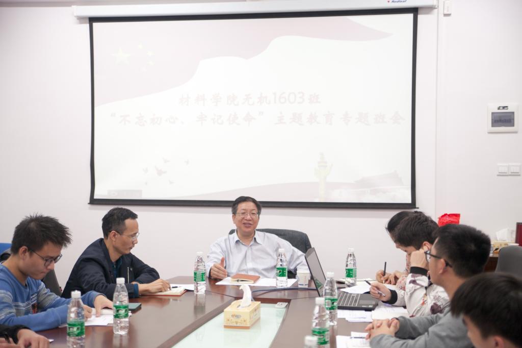 专题班会上,各位领导和老师对主题教育的总要求、根本任务、具体目标和重大意义,以及习近平新时代中国特色社会主义思想的核心要义进行了解析,向同学们深入浅出的阐释了新时代用习新思想武装头脑的必要性。付宏渊从主题教育的重要意义、实现目标以及青年大学生如何加强党的创新理论学习三个方面进行导学;侯伟健讲述了“不忘初心、牢记使命”的深层内涵,联系学校的发展变化以及青年学生的使命鼓励同学们做“有理想、有信念、有家国情怀”的爱国青年;许建兰讲解了马克思主义在中国传播和党的发展历程,以共和国勋章张富清老英雄的故事寄语学生要做奋斗者,以青春书写自己的历史;曾兰桂从国家、社会、个人三个层面介绍了不忘初心的必要性,引导同学们不忘初心、牢记使命,刻苦学习、努力成才;张国强从实现中国梦的需要、学生成长成才的需要明确了开展主题教育的意义,详细阐述了新思想的鲜明特质。班级党员、入党积极分子、学生代表均就学习谈及了自己的体会。学生党员舒琳结合组织发展的历程再次回顾了自己的入党初心,深刻感受到经过党组织的培养和不断的学习,她对党组织的情感日益深厚,更加坚定了自己的信仰,对中国美好的明天也更有信心。材料类1906班郭普特同学认为当前的首要任务是学习,应在学习中坚定理想信念,锤炼道德操守、弘扬正义正气,努力使自己真正成为毛主席所说的“一个高尚的人,一个纯粹的人,一个有道德的人,一个脱离了低级趣味的人,一个有益于社会的人。”随后,与会领导与同学们就近期思想、学生、生活展开了交流,为其答疑解惑。