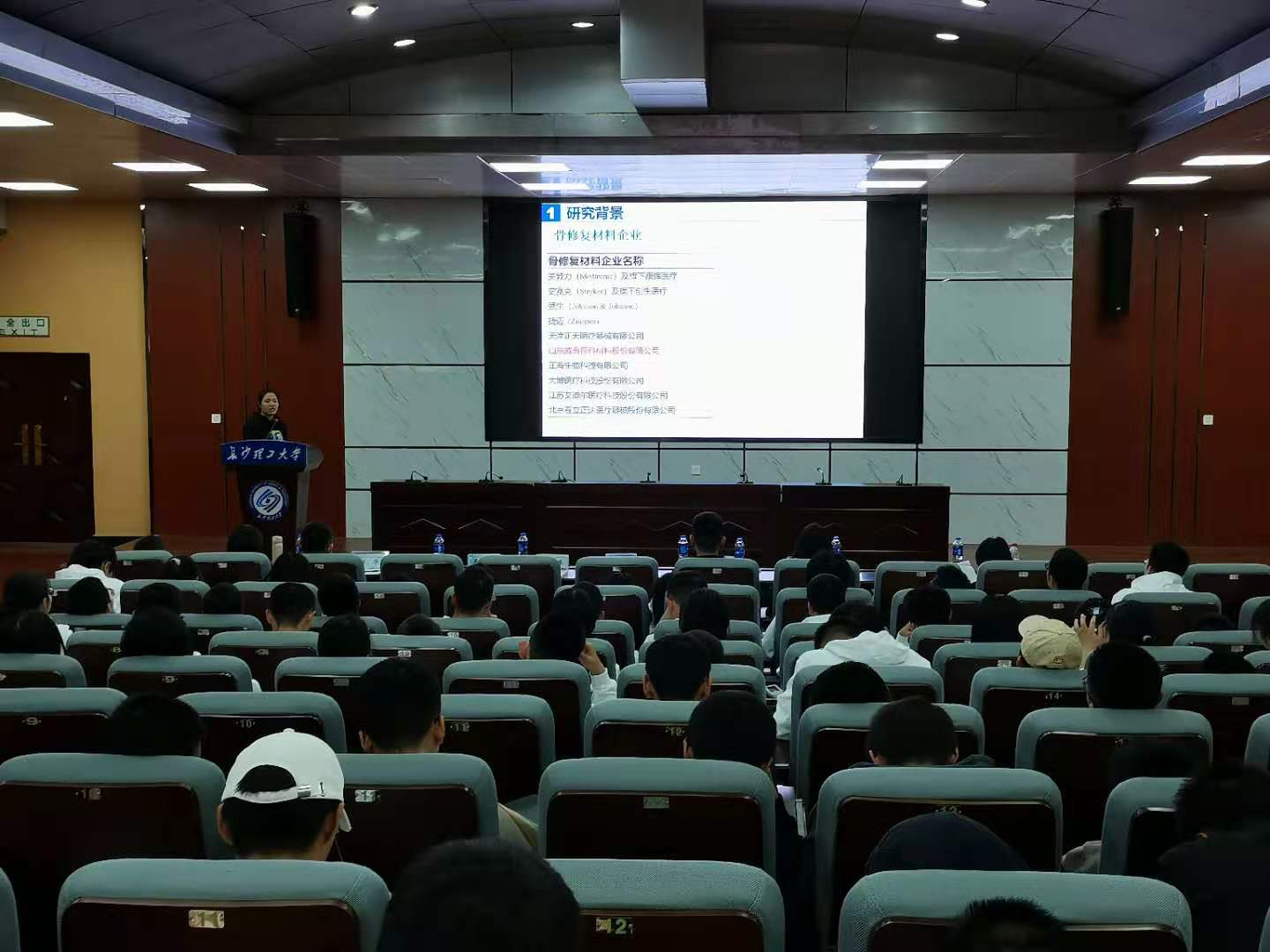 易文君老师以《可降解骨修复材料研究》为题向同学们详细的介绍了羟基磷灰石/聚乳酸复合材料在骨科修复领域的应用。易文君老师指出骨修复材料对我们的生活意义重大,骨组织损伤和缺损是临床的常见病例,其治疗手段一般采用骨移植,自体骨和异体骨移植均存在一定的缺陷口。羟基磷灰石与骨的无机矿物成分近似,具有很好的生物相容性和生物活性,可以与自然骨形成牢固的结合;但单纯的羟基磷灰石陶瓷,脆性大,且降解性能不好,限制了其在临床上的广泛应用。骨是一种天然的复合材料,因此,制备与骨组成、结构相似的无机/有机仿生复合材料成为骨修复材料研究热点。最后,易文君老师指出,在实际应用中骨修复材料不仅应具备良好的生物相容性、骨诱导性、降解性,还应具有三维多孔结构便于组织修复和重建以及合适的孔径和孔隙率有利于细胞、组织长入、血管化及营养物质的运输。经过科研人员不断地努力,使得材料更加贴合人体,大大减少患者的不适与痛苦。