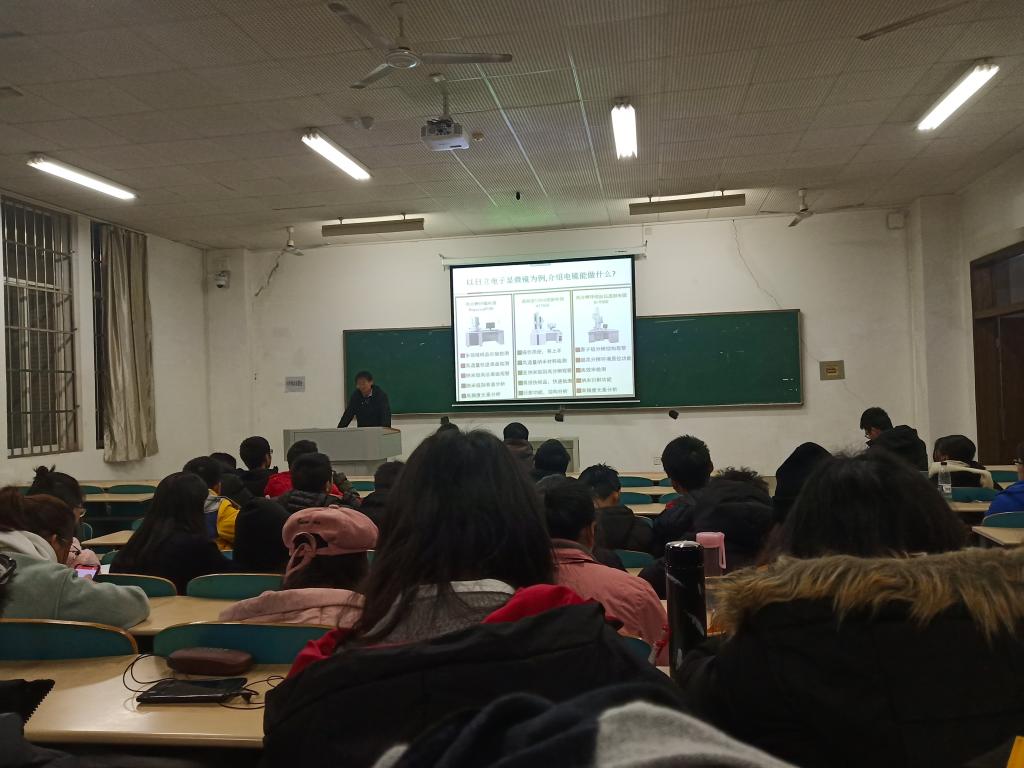 同学们早早地进场并做了准备。18点30分范教授准时开始了今天的讲座。范教授首先介绍了电子显微镜的作用和在材料领域的必要性和重要性。并根据几种不同的电镜分别介绍了它们的作用,首先范教授和同学们介绍的是扫描电镜,范教授讲这种电镜可以将材料放大到几十万倍甚至上百万倍而普通的光学显微镜最大也只能放大到2000倍左右。接下来的透射电镜则更为神奇,范教授告诉同学们这种电镜可以让我们感受到材料的内部结构,据此判断出材料的某些性能以及解释材料反应时出现现象的原因。范教授反复强调:“电镜是分析各种材料结构的基础,没有电镜材料的研究将无法进行下去。”范教授鼓励同学们去了解电镜了解更多的有关材料的事物。范教授结合自己的亲身经历告诉同学们在大学要养成好的习惯:能够去多交流——无论是和同学、和学长学姐还是和老师都要敢于去交流。无论完成什么事情靠自己一个人的力量终究是不够的。大学生协作的能力一定要拥有;敢于多提问——在大学,只要你提出问题,老师一定会尽可能的帮你解答,每个人心中都会有疑惑一定要勇敢地提出来;保持心理健康——同学们要有开放的心态,性格开朗。这样无论遇到什么风吹雨打都可以克服困难。