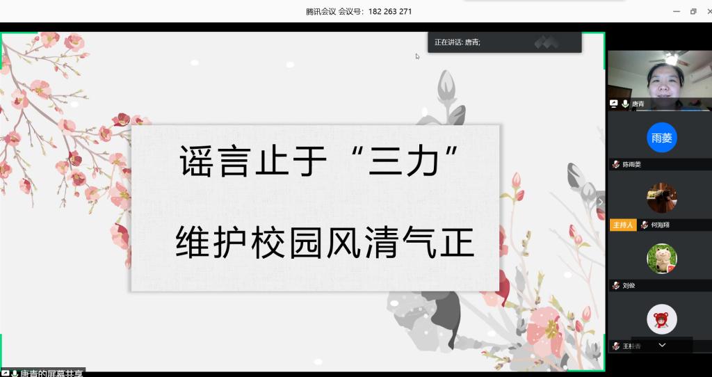 首先,唐青通过一短视频引发全体党员思考,共同探讨疫情对当前生活造成了哪些影响,党员积极留言讨论。接着唐青从疫情改变了什么,影响我们思考和判断的三个因素以及如何增强辨别力、执行力、引领力三个方面展开具体讲解指出此次疫情是一次大考每一位党员要贯彻为人民服务的宗旨,主动完善自身思想体系,学会利用正确的理论武装头脑。最后唐青通过自身实例勉励全体党员要在多元化的信息传播注重理性判断,勇于纠偏,思考正确的发声方式,充分发挥党员先进性的辐射作用,争当科学的传播者、谣言的粉碎机,自觉维护校园风清气正。
