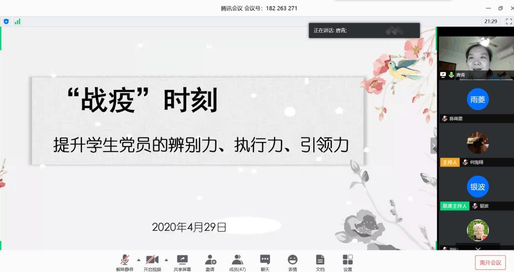 429日,材料学院依托腾讯会议平台组织学生党员专题党课,由学院党总支副书记唐青主讲,学院全体研本学生党员50余人参与。