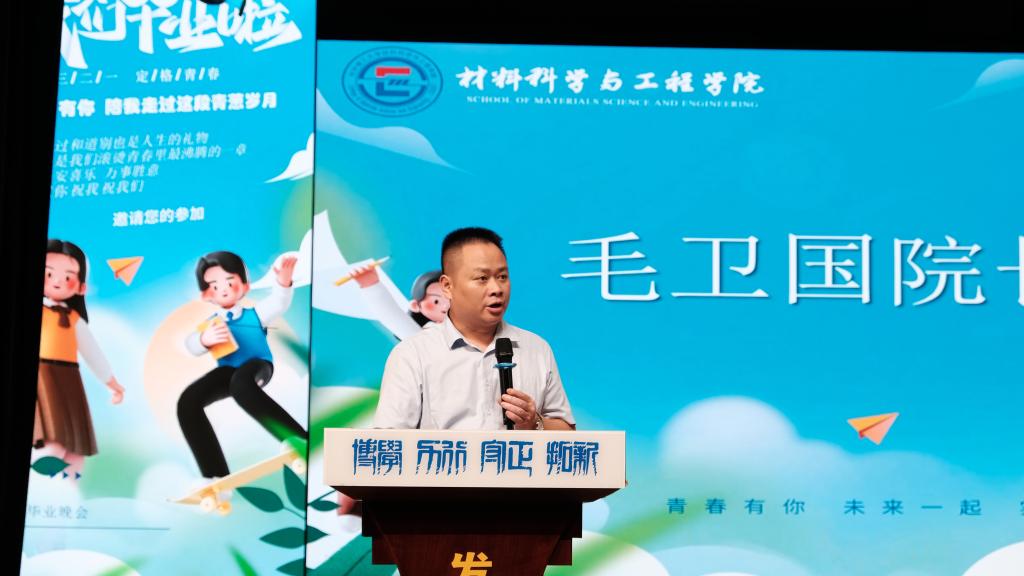 中场时段,材料学院院长毛卫国教授在致辞中向即将踏上新征程的毕业生寄予了殷切的期望。他希望,毕业生们要乘风破浪,持续前行,坚持终身学习、主动思考,在实践历练中迅速成长;要紧跟时代,常怀感恩,树立远大的理想,感悟时代脉搏,主动投身社会,担当职责;要勇于创新,开拓未来,用青春、智慧谱写好奉献祖国、服务社会的人生之歌。”接下来,毛卫国为毕业生代表授旗并宣布永利集团88304官网材料科学与工程学院2024届校友会材料分会正式成立。