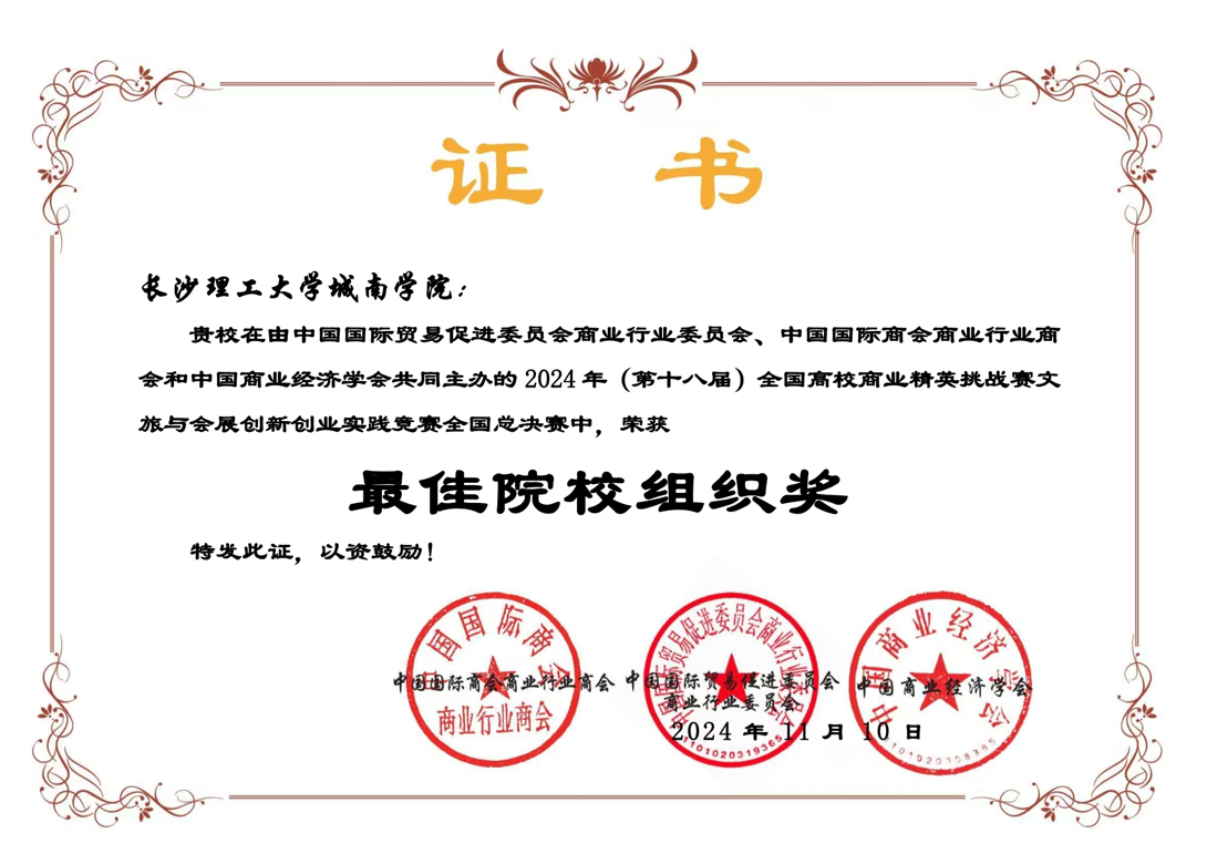 近日,由中国国际贸易促进委员会商业行业委员会、中国国际商会商业行业商会以及中国商业经济学会联合主办的 2024 年(第十八届)全国高校商业精英挑战赛文旅与会员创新创业实践竞赛全国总决赛完美收官。永利集团88304官网城南学院在此次大赛中表现卓越,凭借优秀的组织能力和师生团队的精彩发挥,成功斩获 “最佳院校组织奖”,有力彰显了学院在创新创业教育板块的斐然成果。