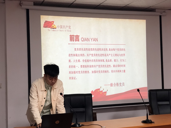 胡俊、黄敏、罗艺婕三位学生党支部副书记集中进行骨干领学习近平新时代中国特色社会主义思想。胡俊就新时代思想形成背景和新时代思想解读两个部分进行讲学,重点指出中国共产党人的初心和使命就是为中国人民谋幸福,为中华民族谋复兴,提醒大家要真正理解并做到“不忘初心、牢记使命”,并让大家树牢“四个意识”、坚定“四个自信”、做到“两个维护”,为中华民族的伟大复兴贡献力量。黄敏对《习近平关于“不忘初心、牢记使命”论述摘编》进行摘选讲解,特别强调党员要遵守党的政治纪律,提高政治意识、自觉意识,绝不允许“上有政策,下有对策”,并延伸列举出学生党员工作落实不到位的问题。针对各支部的作风问题,各支部内部要积极开展批评和自我批评。罗艺婕上台讲解党中央的作风建设,表明作风反映的是形象和素质,体现的是党性。学生党员必须以上率下,以钉子精神落实具体工作。