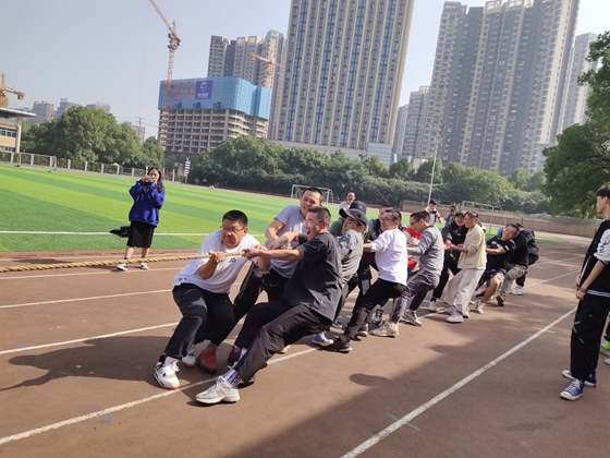 比赛哨声一响起,队员们便使出浑身力气,把绳子向后拉,绳子中间的红线左右摇摆。两边队员都整齐地往后倒、向后退,学生会主席团成员也在队伍旁边助阵加油,恨不得抓起绳子和学弟学妹们一起努力,啦啦队此时大喊“加油”!号子声、呐喊声,此起彼伏,飘荡在整个操场上空。