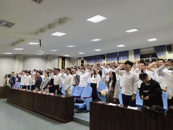 大会开始第一项,全体起立,奏唱团歌并宣誓,在宣誓过程中,大家声音洪亮且富有激情,表达了对共青团和党组织的热爱。紧接着由老师们为主席团成员和各部门干事佩戴团徽,并拍照留念,整个过程有条不紊,在欢声笑语的交谈中拉近了老师与学生的距离。大会第三项是各部门展示风采,各干部介绍本部门工作事项,让干事们能够对每个部门的工作职能有所了解。