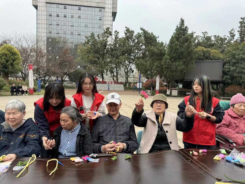 志愿者们以趣味游戏拉开活动序幕,带领老人玩起“彩圈串串大战”和“斗智斗勇抢彩条”,老少组队,默契配合,笑声不断。随后,手指操环节登场。志愿者耐心示范,教老人们做健康手指操,促进血液循环。80岁的王爷爷笑称:“手指做完操,灵活多了,孩子们教得真仔细!”手工互动环节更是创意满满。志愿者与老人结对,用扭扭棒、粘土等材料制作手工花朵。游戏既锻炼了老人的反应力,也增进了彼此间的情谊,现场气氛热烈。在志愿者的指导下,老人们渐入佳境,创作出各具特色的作品。志愿者还巧思制作可爱眼镜,送给老人们作为纪念。