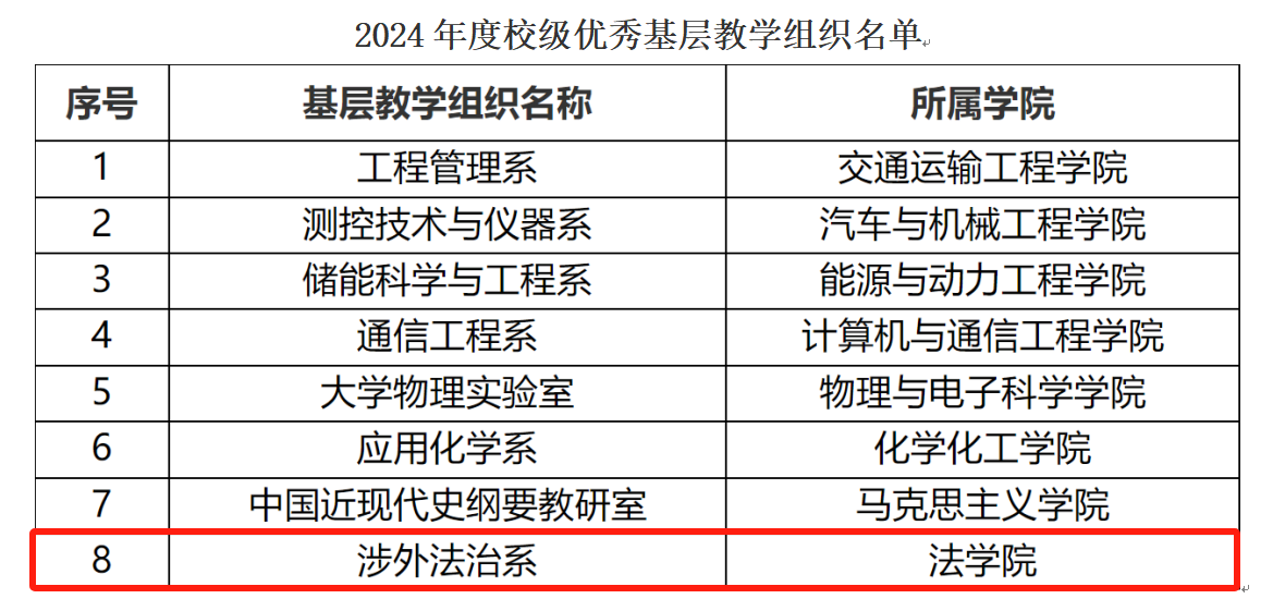 近日,经专家多轮评审永利官网评选出8个校级优秀基层教学组织,我院涉外法治系荣获2024年度校级优秀基层教学组织称号。