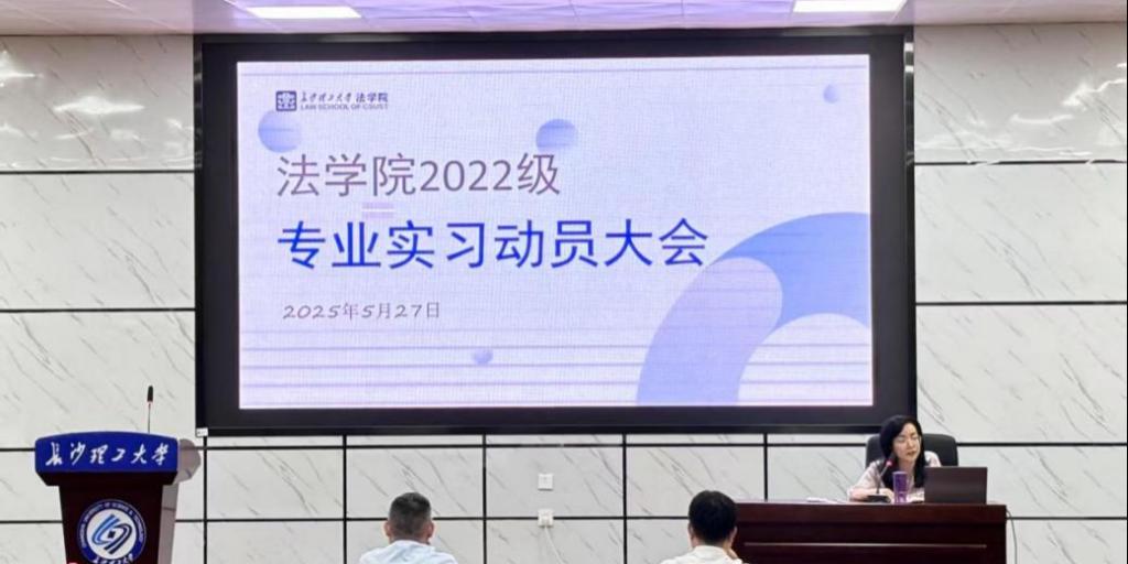 为进一步提高学生法务实践能力,保障学生专业实习顺利进行,5月27日下午,法学院在金盆岭校区四教学术报告厅召开2022级本科生专业实习动员大会。院党委书记龚文斌、副书记汪伦和副院长徐莉出席会议,实习指导教师阳明武、宁佳、李姝,辅导员孙佳乐老师和全体2022级本科生参会,会议由涉外法治系副主任贾佳主持。