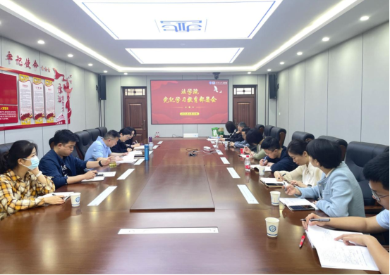 4月30日上午,法学院在金盆岭四号教学楼313会议室召开党纪学习教育启动部署会。会议由院党委书记龚文斌主持,院领导班子、行政各办主任、系主任、副主任和各支部书记参加了会议。