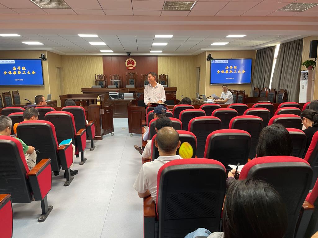 9月27日下午,法学院在金盆岭校区模拟法庭(4教317)召开全体教职工大会,学习传达全省教育系统安全防范动员电视电话会议精神和学校领导指示精神。会议由党总支书记田兴洪主持。