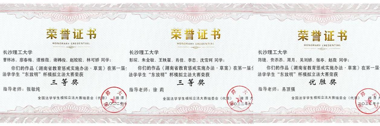 我院在本次大赛中取得优异成绩,得益于我院坚持以“产教融合”理念为指引,贯彻“四位一体”的育人机制。今年来,法学院依托永利集团88304官网地方立法研究中心开展了《湖南省茶产业发展促进条例(草案)》、《湖南省气象灾害防御条例(草案)》、《湖南省水资源管理条例(草案)》等多项立法起草服务项目,其中《湖南省茶产业发展促进条例》已于2022年9月26日经湖南省第十三届人民代表大会常务委员会第三十三次会议通过,参与本次大赛获奖的同学也大多参加过立法起草相关工作,具有丰富的地方立法实践经验。同时,法学院一直积极组织开展法律文书写作比赛、研究生法律案例大赛等各种学科竞赛,激发学生学习兴趣,培养学生创新思维、团队合作以及解决实际问题的能力,鼓励支持学生参与校内外各类法学竞赛,打造知识、能力、素质协调发展的创新型人才,并坚持以学科竞赛为引领,推动研究性教育教学改革。此次参赛有助于提高学生的知识应用能力、实践创新能力、沟通和团队协作能力,这对于学生未来的发展,无论是学术研究方面还是工作处事方面,都是一个很好的锻炼机会,也是学院全面培养具有创新精神和实践能力的高素质创新型法治人才的体现。