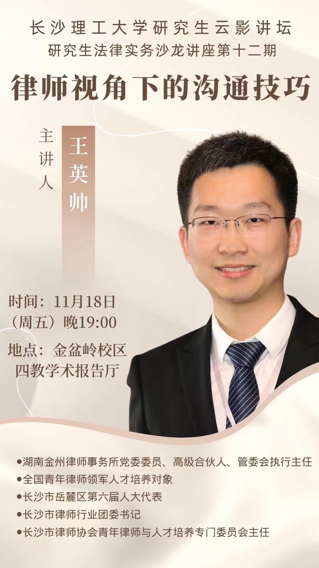 为拓展学生法律视野,提升青年学生的综合能力,11月18日,永利集团88304官网法学院“云影讲坛研究生法律实务沙龙”第十二期如期举行。本期以《律师视角下的沟通技巧》为主题,由湖南金州律师事务所王英帅律师主讲,我院杜卫红老师担任讲座主持人,我院田兴洪书记出席本次讲座,240余名学生聆听讲座。
