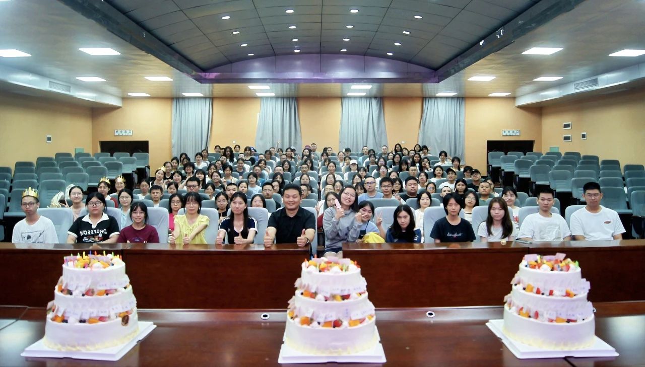 咱们年级今年共有133名新同学,其中38位同学还未满18岁,13人9月份生日,8人的生日在军训期间,2人在开学第一天,我们当时为他们集体合唱了生日快乐歌”电影思政课结束后,伴随着兰贵辉老师口中一个个新生数据,高年级学长学姐们推着三个写满了全部新生姓名的三层蛋糕进入会场,引起了现场的轰动,学院中秋系列活动终于来到了最后一个惊喜环节--“十八岁成人礼”集体生日会。