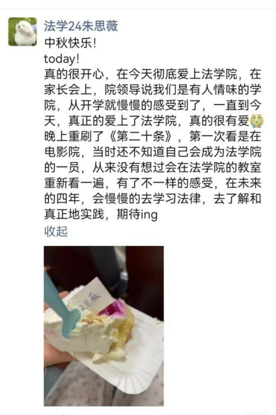 此次学院中秋系列活动围绕“懂得集体与分享”、“学会规矩与自律”、“感受法学专业内涵与价值使命”、“见证仪式与成长”展开,期盼在中秋佳节,让2024级新生全方位感受到学院的关怀和温暖,让所有2024级新生真正成为“崇德尚法、守正致公”的法苑人。愿每一位法学院的新生在未来的日子里都能以梦为马,不负韶华!