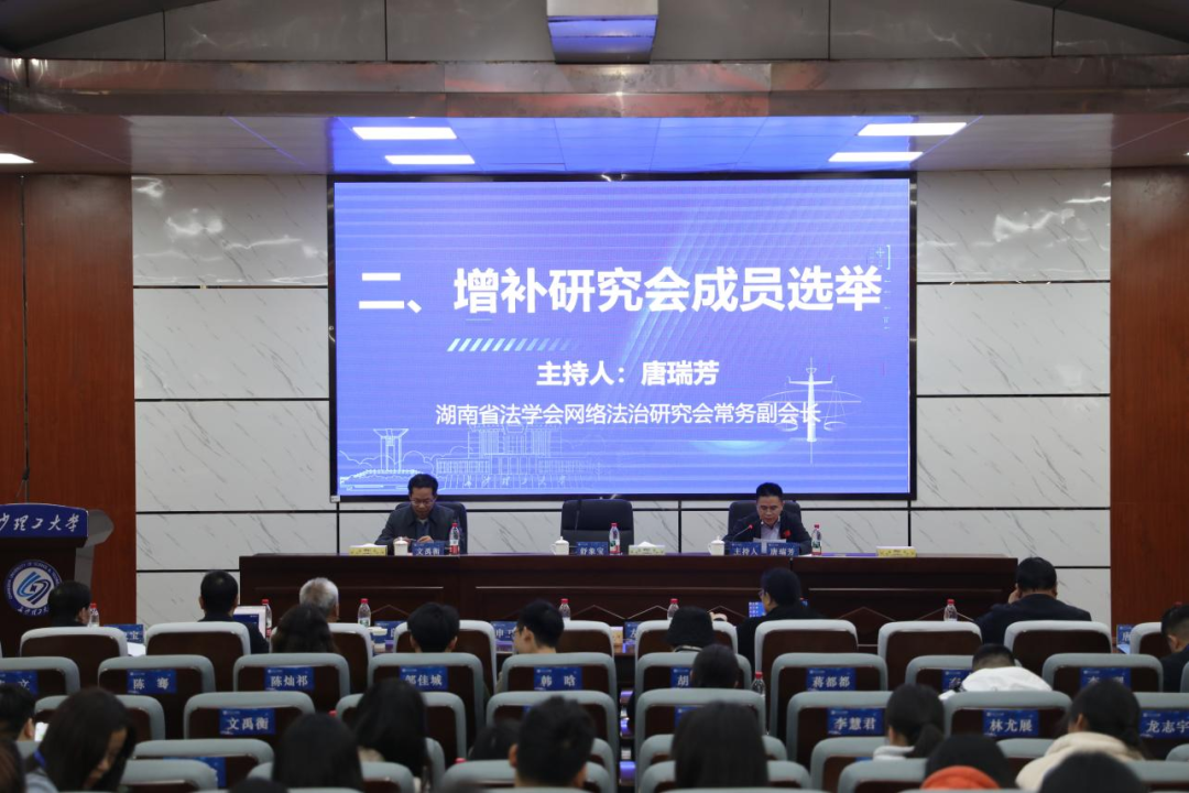 开幕式结束后,会议进入研究会成员增补选举环节,由湖南省法学会网络法治研究会常务副会长唐瑞芳主持。湖南省法学会网络法治研究会秘书长文禹衡介绍了增补工作情况及理事、副会长候选人建议名单,经参会代表现场表决通过。此次增补选举进一步优化了研究会的人员结构,充实了理论与实务骨干力量, 为研究会后续工作开展提供了更坚实的人才保障。