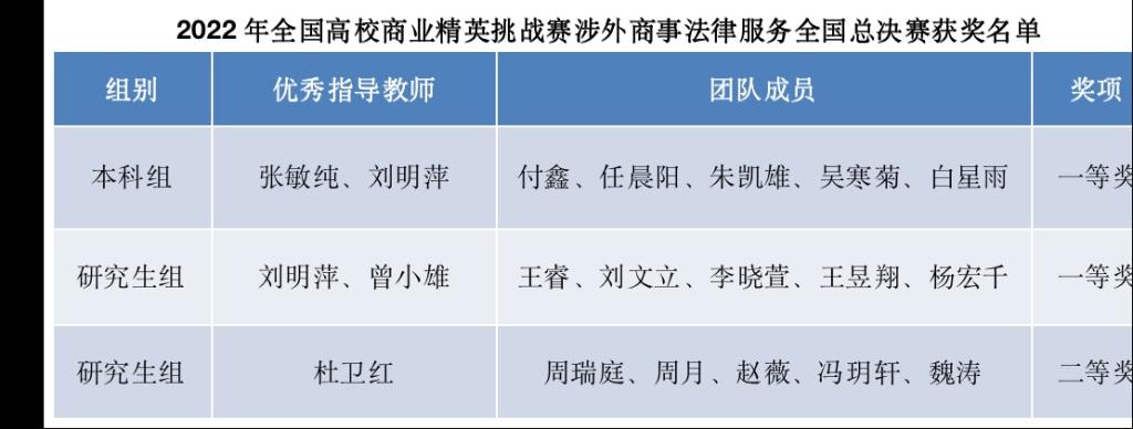 近日,2022年全国高校商业精英挑战赛国际贸易竞赛全国总决赛完美闭幕,在本次比赛中,由法学院本科生与研究生组成的三支队伍在指导老师和队员们的不懈努力下成功入围涉外商事法律服务赛道总决赛,勇夺该赛道一等奖两项,二等奖一项。此次竞赛共有来自全国132所高校的625支队伍参赛,共角出的14个一等奖中永利官网荣获两项,这是永利官网积极回应国家“加快建设涉外法治人才队伍”的要求,着力培养高素质涉外法律人才的集中体现。