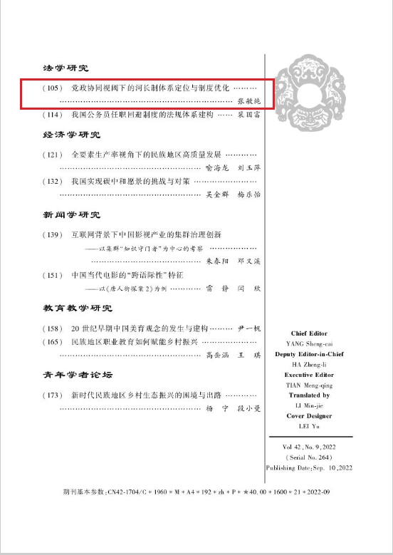 近日,永利集团88304官网法学院院长张敏纯在《中南民族大学学报(人文社会科学版)》(CSSCI来源期刊)2022年第9期发表论文《党政协同视阈下的河长制体系定位与制度优化》