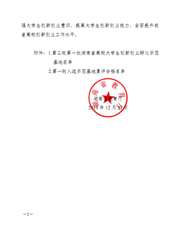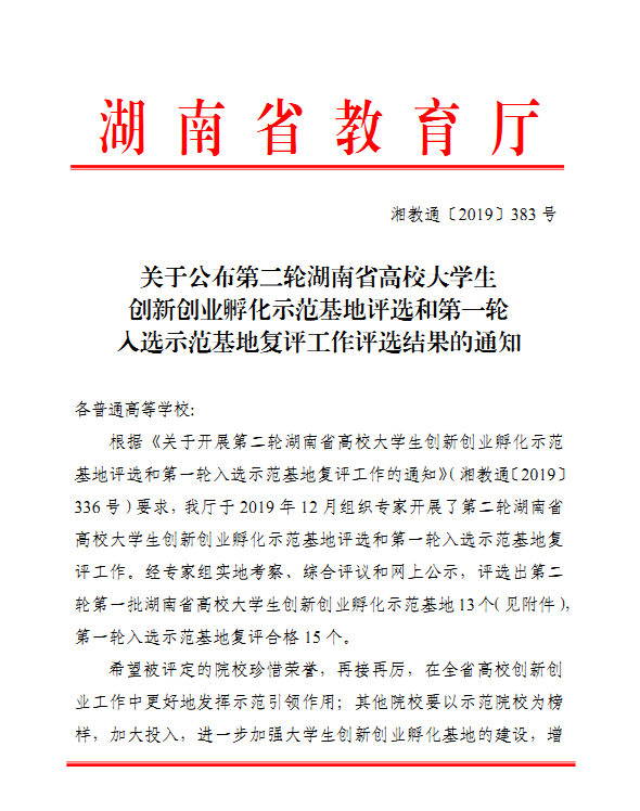 省教育厅于 2019 年 12 月组织专家对全省高校开展了第二轮湖南省高校大学生创新创业孵化示范基地评选和第一轮入选示范基地复评工作。经专家组实地考察、综合评议和网上公示,永利官网大学生创新创业园被复评为湖南省高校大学生创新创业孵化示范基地。
