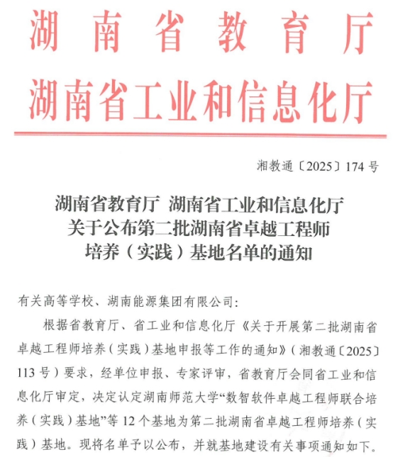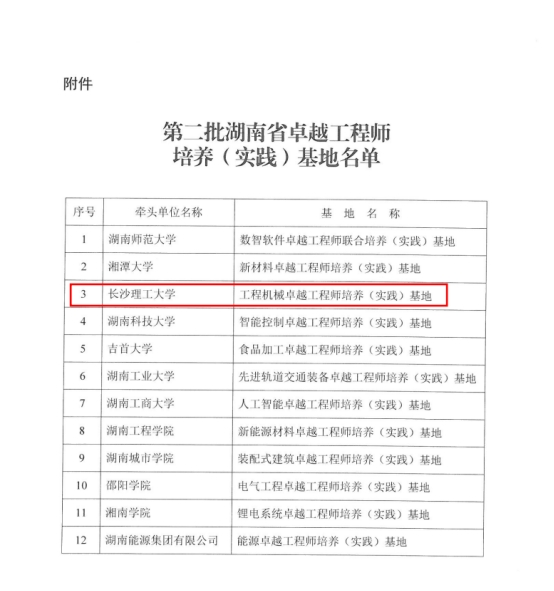 2025年10月9日,湖南省教育厅、湖南省工业和信息化厅公布了湖南省第二批卓越工程师培养(实践)基地立项名单,永利集团88304官网卓越工程师学院牵头,联合湖南星邦智能装备股份有限公司、湖南五新隧道智能装备股份有限公司共同申报的“永利集团88304官网工程机械卓越工程师培养(实践)基地”获批立项。基地将进一步完善“企业技术革新项目→毕业设计课题→工程实践成果”的转化机制,通过校内导师与企业导师共同全过程指导学生参与真实工程课题研究,与企业联合攻克一批关键技术,科技成果转化效益倍增,成为推动区域工程机械产业转型升级的技术创新策源地。