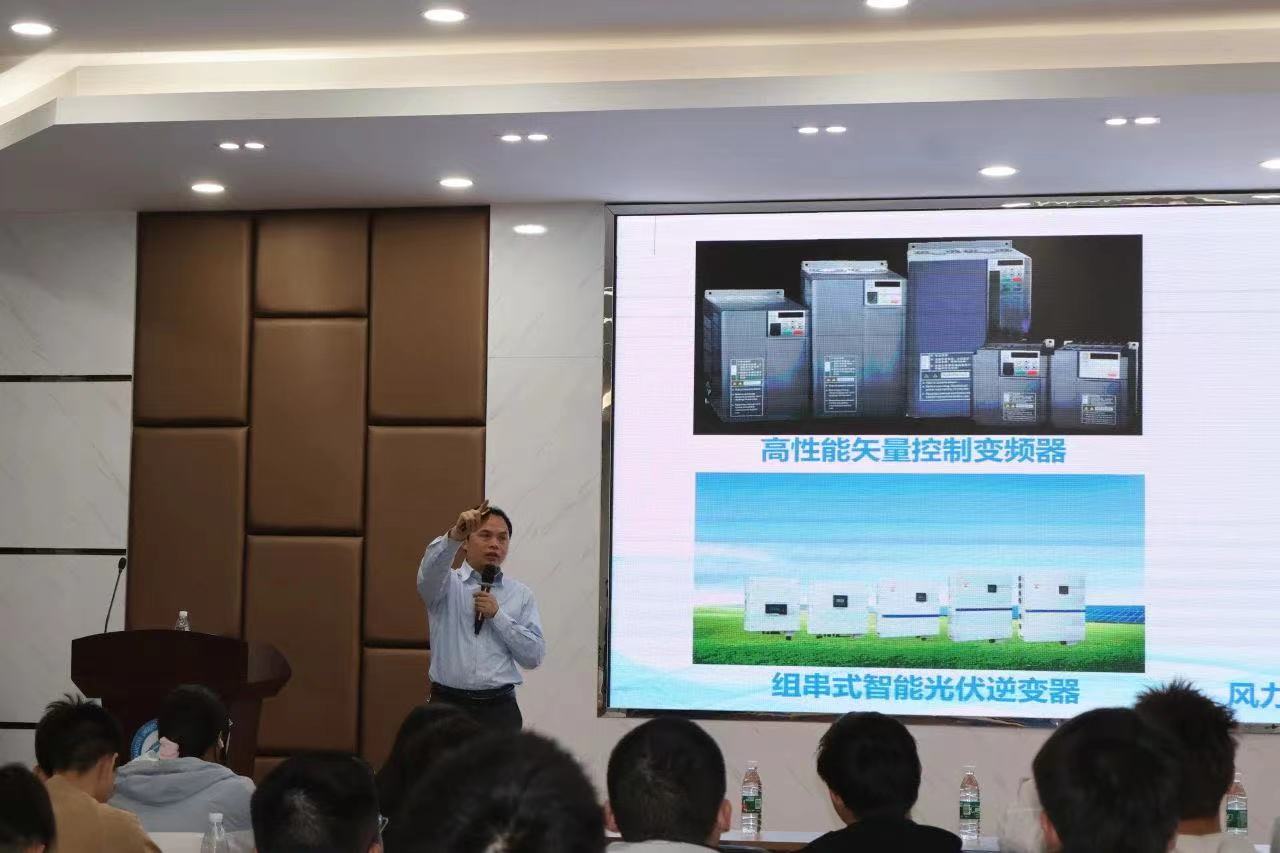范必双向同学们介绍了团队在电力电子技术、新能源灾害防治等领域的最新科研成果。如在电力电子技术领域,团队研发包括风力发电机三合一变桨驱动器、高性能矢量控制变频器、智能光伏逆变器等在内的多项核心技术和产品。在新能源灾害防治领域,开发风机叶片气热防除冰系统等关键技术等。同时结合自身经历给与同学们学习与择业方面的建议。