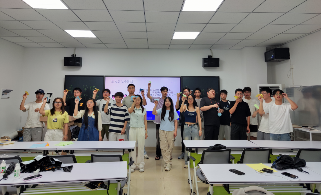 “压力放飞”活动中,心委给每位同学发放彩纸,同学们在纸上写下近期困扰自己的压力或烦恼,随后将纸张折成纸飞机,集体放飞。这一环节不仅让同学们以象征性的方式释放压力,也让大家在集体行动中感受到彼此的支持。不少同学表示,看着纸飞机飞出去的瞬间,心情轻松了许多。