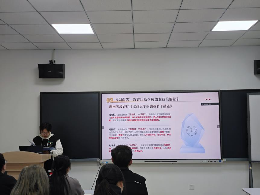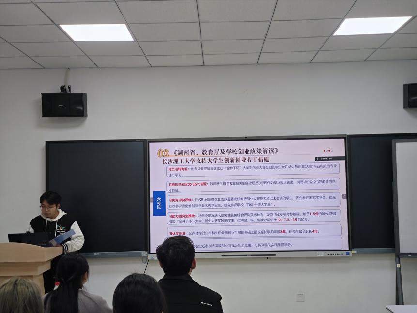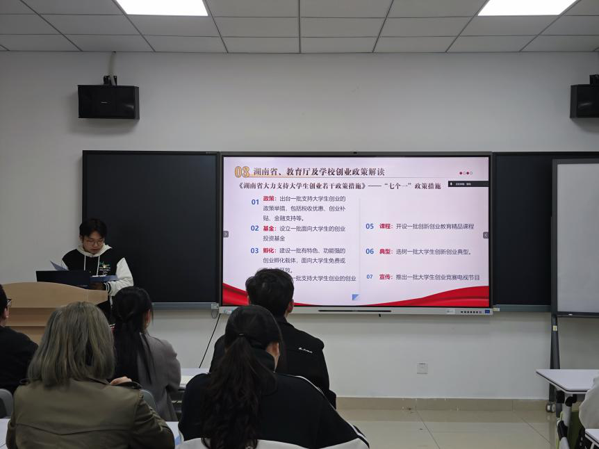 活动中,黄金同志详细解读了《湖南省大力支持大学生创业若干政策措施》的核心内容,重点介绍了“七个一”举措,并结合《支持大学生创业若干措施》《永利集团88304官网支持大学生创新创业若干措施》等文件,系统阐释了“两直接”“三优先”“两配套”及“六可以”等具体政策。针对学生群体,我们详细介绍了政策中的“六可以”,包括:创业经历及成果可折算学分、可替代毕业论文(设计)、创业学生可休学创业、可灵活转专业、可参评评优评先、可推荐免试保研。此外,黄金同志还介绍了本校大学生创新创业园的相关扶持政策,以及第二届“金种子杯”大学生创业大赛的实施方案,鼓励同学们,特别是作为高年级党员,积极把握政策机遇,带动广大学弟学妹锤炼创新本领,勇于投身创业实践。