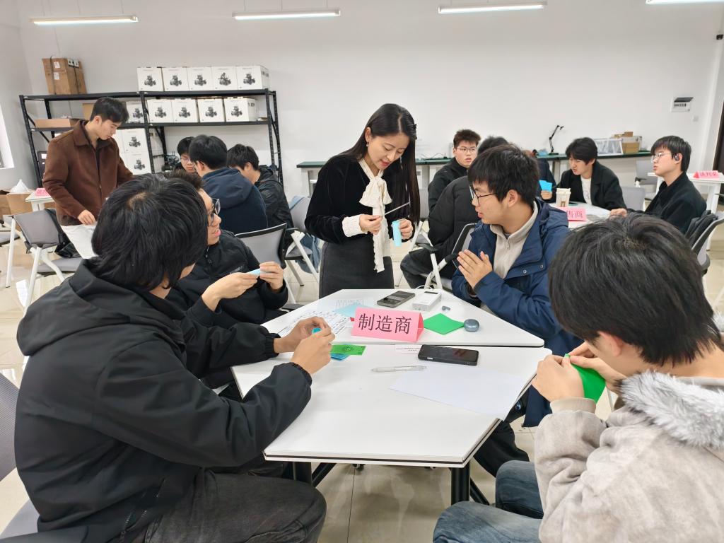 活动现场气氛紧张而热烈。讨论声、争辩声不绝于耳。制造商与零售商之间围绕采购价格与数量展开多轮激烈谈判,每一次签约都牵动着小组的现金流与库存安全。尤其在第2至第5周,随着市场需求起伏、情景卡带来的突发支出与“强制消费”,各小组频繁面临资金链紧张、生产计划调整与合同履约压力。面对不确定性,同学们从最初的焦虑、犹豫,逐步学会冷静分析、灵活应对,在一次次压力中与伙伴共同寻找破局之道。
