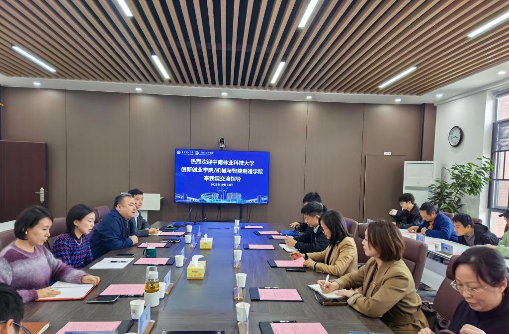 2025年10月24日下午,中南林业科技大学创新创业学院(就业指导中心)副院长樊毅,机械与智能制造学院副院长龚桂良、党委副书记徐钰婷一行14人来校调研交流。党委书记杨晨、党委副书记陈华、副院长吴钢、产教融合发展中心副教授商雄军、教育教学办公室主任计潇参加交流会。会议由吴刚主持