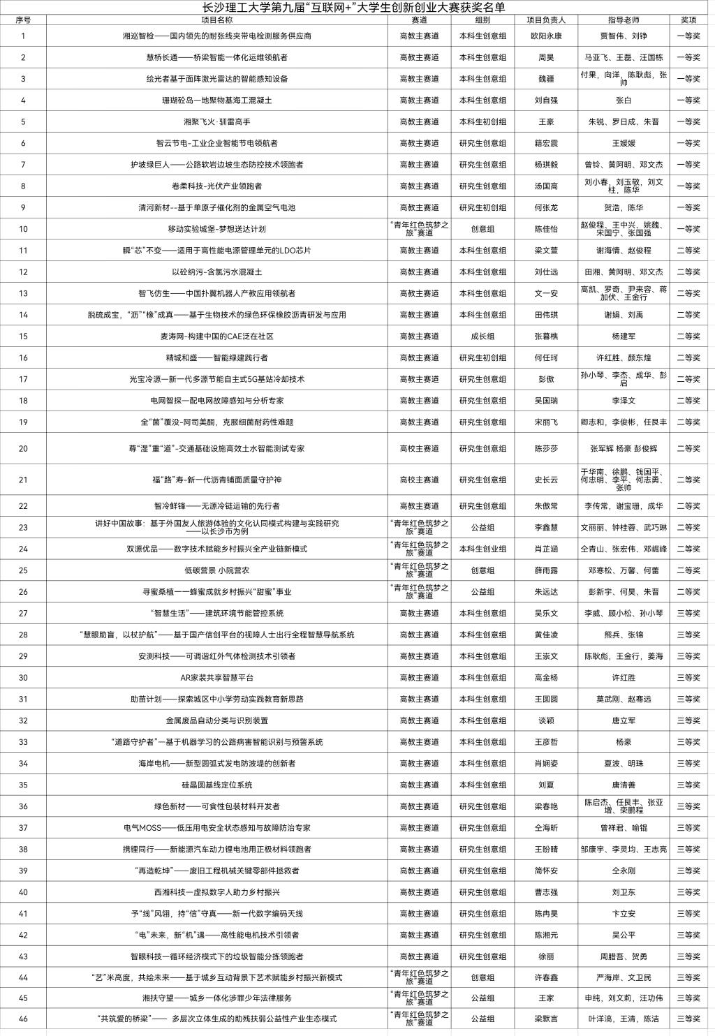 本届大赛共有3490个项目报名参赛,通过各学院院赛遴选,推荐56个项目参加校赛,经校赛半决赛14位评委和决赛11位评委的评审,最终46个项目获奖,其中一等奖10个,二等奖16个,三等奖20个,媒体推荐奖1个,具体名单如下:
