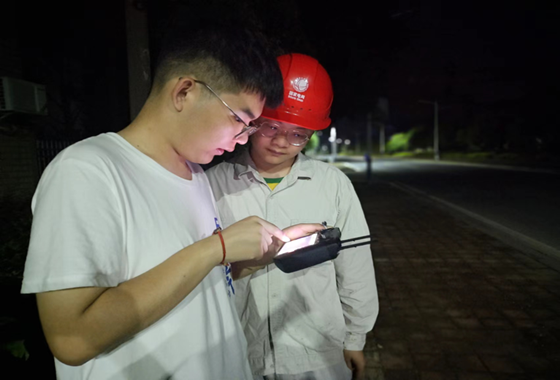 “无人机就绪,准备起飞测温!”7月6日晚,电气学院赴国网韶山市供电公司实践队运检组队员秦李朝政、梁晨、彭忠伟、毛荣毅跟随国网韶山供电公司配电班副班长朱博寰、团委书记蒋虎港等对10kV韶园线线路开展夜间无人机巡检工作。