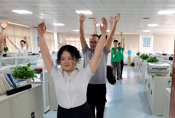 每日上午十点半,株洲中车机电科技有限公司的办公楼六楼事业部办公室内就会响起充满活力的音乐。技术部职工和实践队员随着音乐做起广播体操。“大家都动起来!把胳膊腿都伸展开”,综合主任专员张君负责每日广播操的领操工作。工间操活动有效缓解了工作疲劳,增强了公司职工与实践队员的体魄,展现了中车集团特有的企业文化。工业自动化事业部的易剑晖设计工程师表示:“自从有了举办工间操活动,我感觉更有青春活力了,就像眼前这些年轻人一样。”