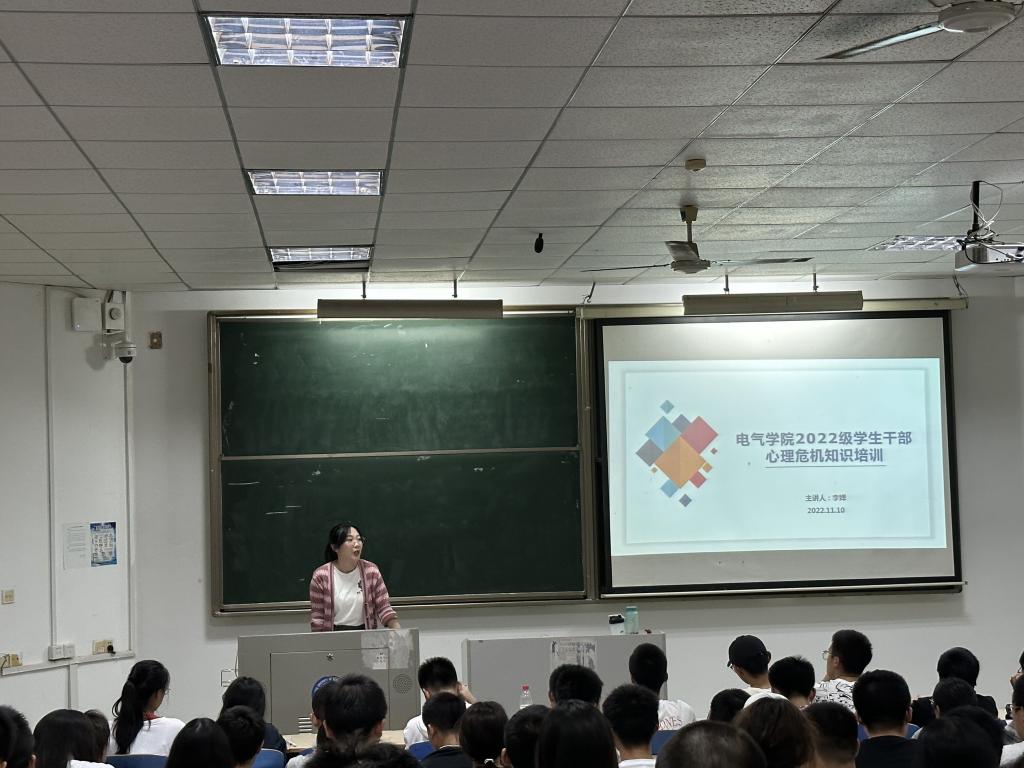为提高学生干部心理健康工作知识水平,做好科普教育,电气学院于11月10日晚在金盆岭校区6教208教室开展心理危机知识培训。此次培训由学院心理辅导员李婵主讲,22级210余名班干部参加。