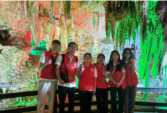 走进梅山龙宫,队员们乘船荡舟,踏水寻仙,仰观龙宫九重天,后漫步静观,细品石笋、石钟乳、雾凇。队员们对景观赞叹不已,被大自然所震撼,沿路探讨它的形成过程。路上队员们提出些许对这溶洞奇观的疑惑,导游对这些问题一一进行解答。队员们了解到溶洞是长时间地质作用形成的,它是自然界几百万年来的杰作,洞内的石笋、钟乳石是由地下水长时期沉淀形成,展现了大自然奇妙的创造力。