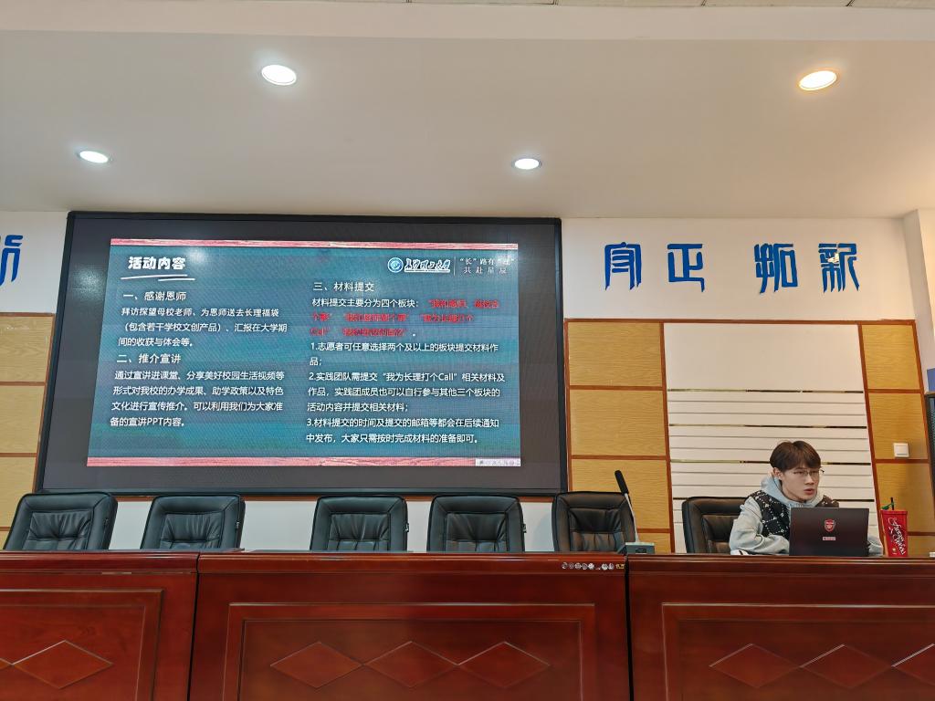 培训会上,实践部部长兼分管主席刘运来首先向活动参与者们介绍了“回访母校”活动的背景和意义,指出可以通过宣讲进课堂、分享美好校园生活视频等形式对永利官网的办学成果、助学政策以及特色文化进行宣传推介,强调了宣讲工作的重要性。随后,他详细讲解了开展宣讲时的技巧和方法,包括如何准备演讲内容、如何与听众互动、如何应对突发状况等以及相关申报材料的准备。此外,刘运来向活动参与者们展示了宣讲的演示文档和宣传视频,分享了相关的宣讲经验和心得体会,让活动参与者们更加深入地了解了宣讲工作的重要性和挑战性,也让大家更加有信心和准备去迎接即将到来的宣讲任务。