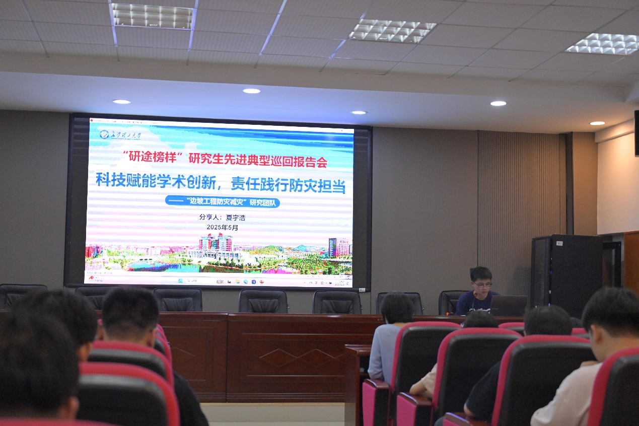 第三位汇报人是边坡工程防灾减灾研究团队的夏宇浩。团队自2011年成立以来,12位教师带领70余名硕博研究生深耕生态护坡、智能预警等领域。他们踏遍三湘四水10余个县市,将科研成果应用于5000余人的防灾实践,相关事迹获新华网、人民日报等媒体40余次报道,总阅读量超50万次。团队累计发表论文80余篇、授权发明专利20余项,以"科技为盾、责任为矛",在边坡灾害防治一线交出亮眼答卷,彰显科研服务民生的使命担当。