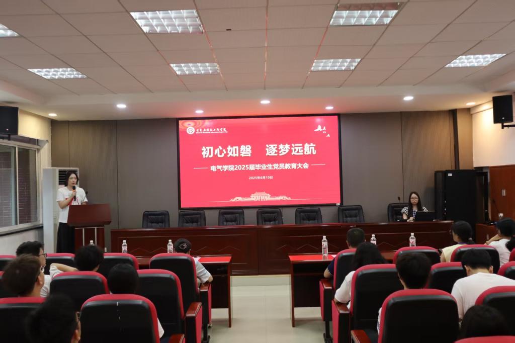 为强化毕业生党员教育,激励青年学子勇担时代使命,6月10日晚,电气学院在工一B503报告厅举行2025届毕业生党员教育大会。学院党委书记丁丹出席并上专题党课,党委副书记周巍出席并讲话,学生党总支副书记熊文娟及全体毕业生党员参加。